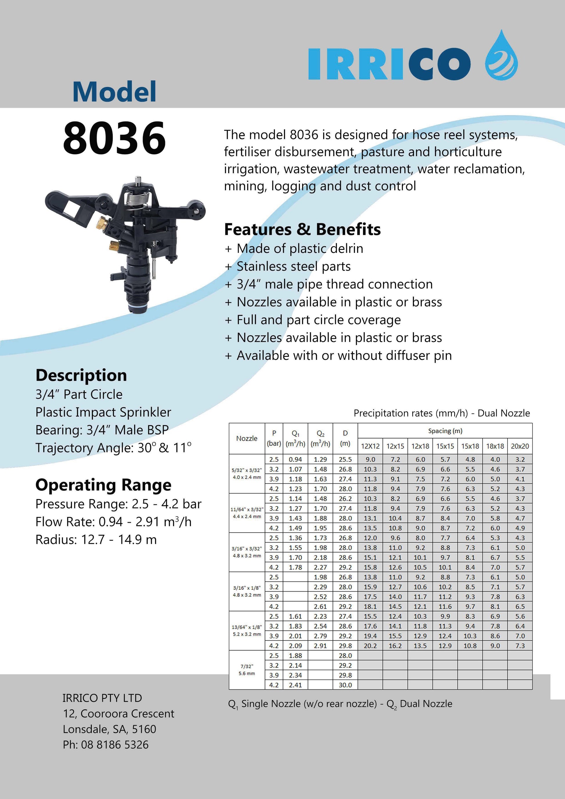 The model 8036 is designed for hose reel systems, fertiliser disbursement, pasture and horticulture irrigation, wastewater treatment, water reclamation, mining, logging, and dust control